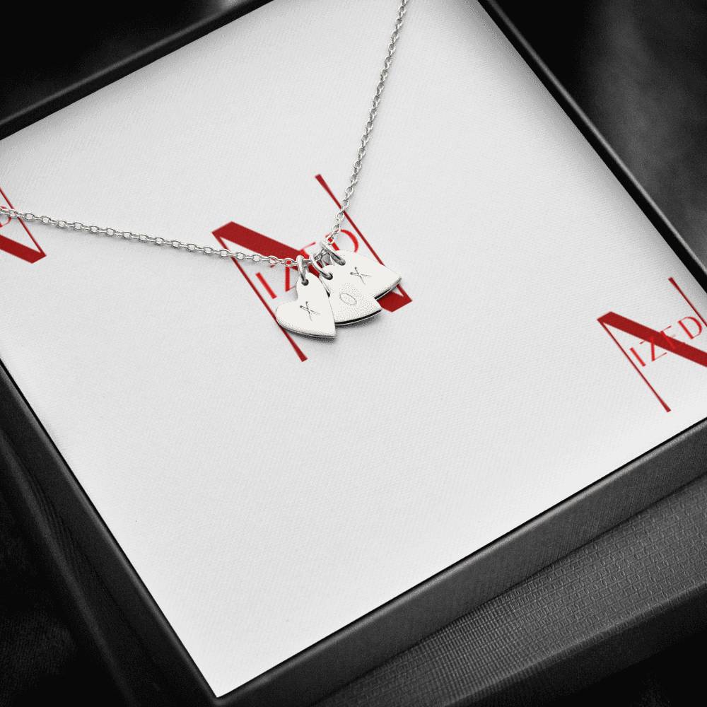 Die Sweetest Hearts Halskette ist in Sterling Silber oder 18K Gelbgold über Sterling Silber erhältlich, mit 1, 2 oder 3 Herzanhängern pro Halskette Ihrer Wahl. Jeder Herzanhänger wird von Hand mit einem Buchstaben Ihrer Wahl in einer modernen, lesbaren Schriftart gestempelt.